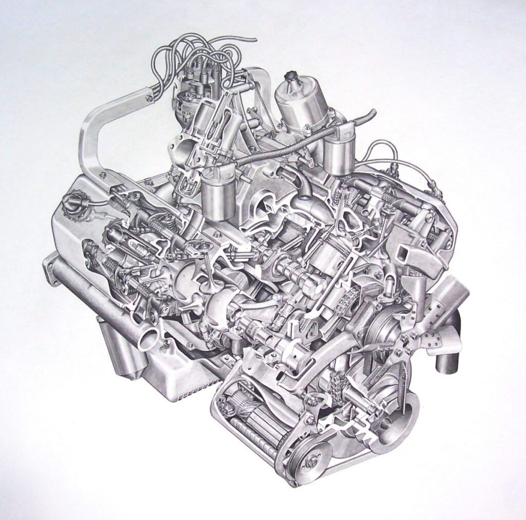 The Daimler 250 V8 saloon, introduced in 1962, was closely related to the Mk2 following Jaguar’s acquisition of Daimler Company in 1960. Although outwardly similar to the Jaguar, the Daimler featured a distinctive fluted grille and was powered not by Jaguar’s XK engine but by Daimler’s compact 2.5-litre V8, originally designed by Edward Turner. This lighter, high-revving engine gave the Daimler a different character—smoother and somewhat more refined, though slightly less powerful than the 3.4 and 3.8 Jaguar variants. Internally, the Daimler emphasized traditional luxury, often with upgraded trim details. Production of both models continued through the 1960s, and they remain highly regarded today as quintessential examples of the compact British sporting saloon: cars that successfully fused performance engineering with mid-century executive comfort.