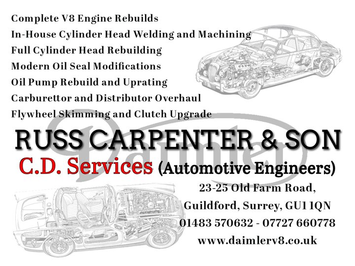 The Daimler 250 V8 saloon, introduced in 1962, was closely related to the Mk2 following Jaguar’s acquisition of Daimler Company in 1960. Although outwardly similar to the Jaguar, the Daimler featured a distinctive fluted grille and was powered not by Jaguar’s XK engine but by Daimler’s compact 2.5-litre V8, originally designed by Edward Turner. This lighter, high-revving engine gave the Daimler a different character—smoother and somewhat more refined, though slightly less powerful than the 3.4 and 3.8 Jaguar variants. Internally, the Daimler emphasized traditional luxury, often with upgraded trim details. Production of both models continued through the 1960s, and they remain highly regarded today as quintessential examples of the compact British sporting saloon: cars that successfully fused performance engineering with mid-century executive comfort.